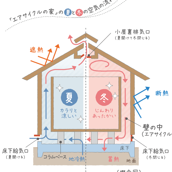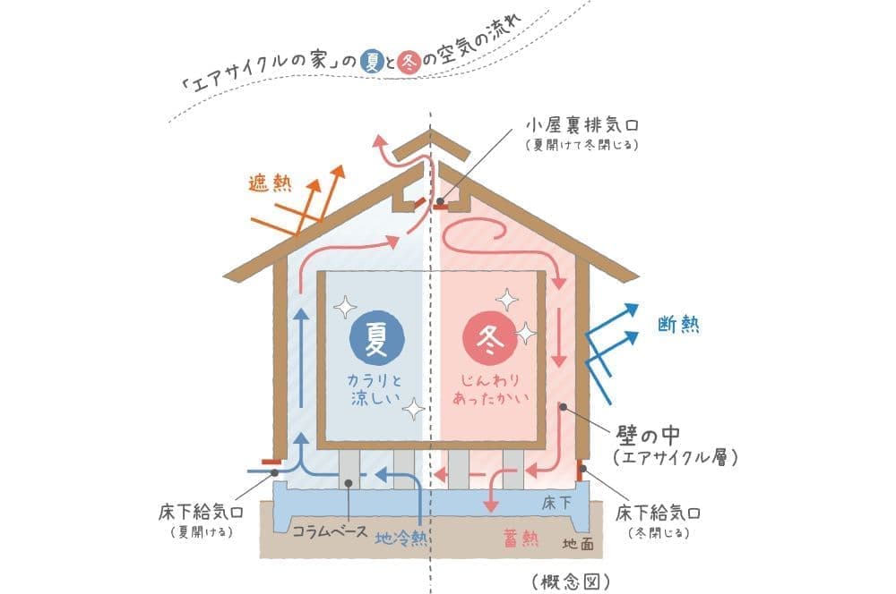 この夏と冬を着せ替えるエアサイクルの家の考え方は、エバーグリーンの家づくりの大きな軸となる技術なのです。