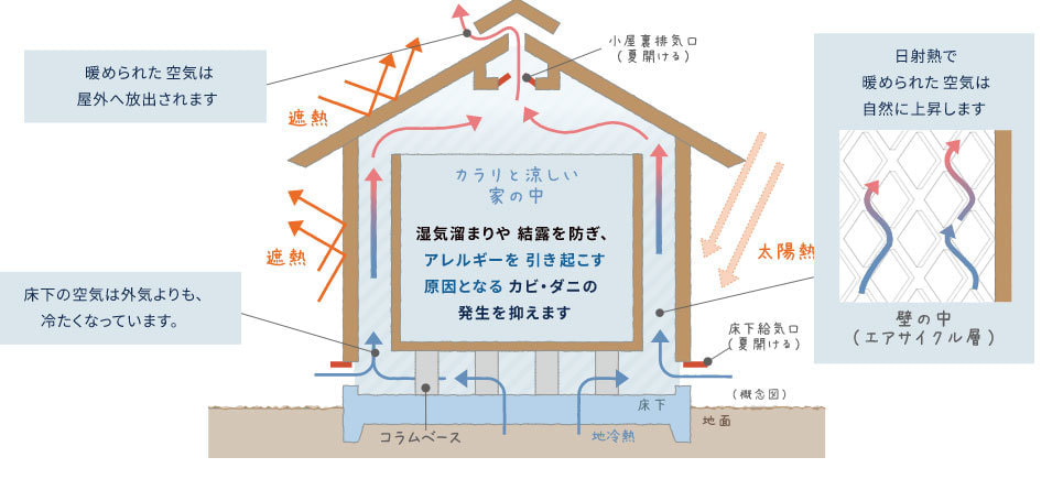 エアサイクルシステムとは、床下・壁体内・小屋裏空間を連通した空気層で結び、空気の温度上昇効果を利用し、ここに空気の流れを発生させます。