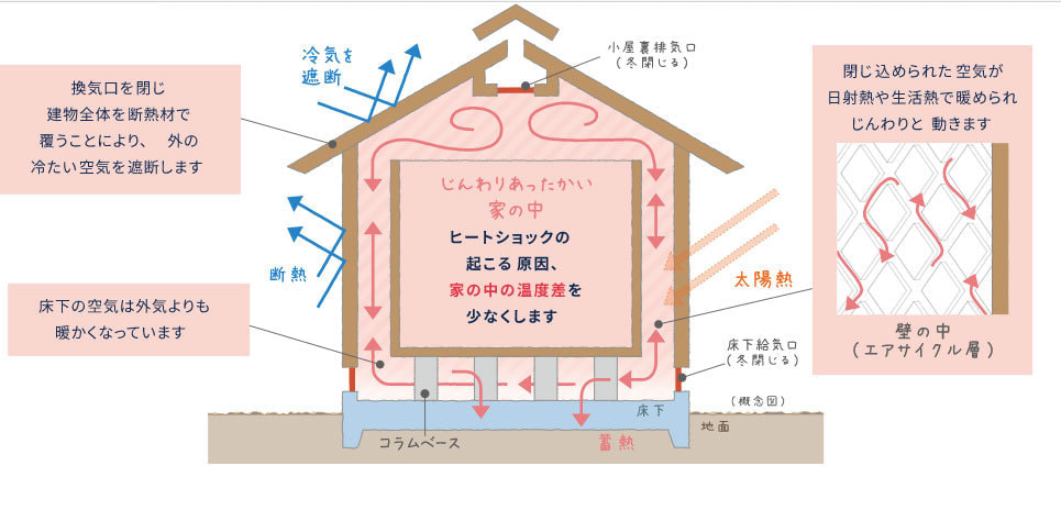 このような考え方で建てることによって、家の中での場所による温度差が少なくなる家になります。