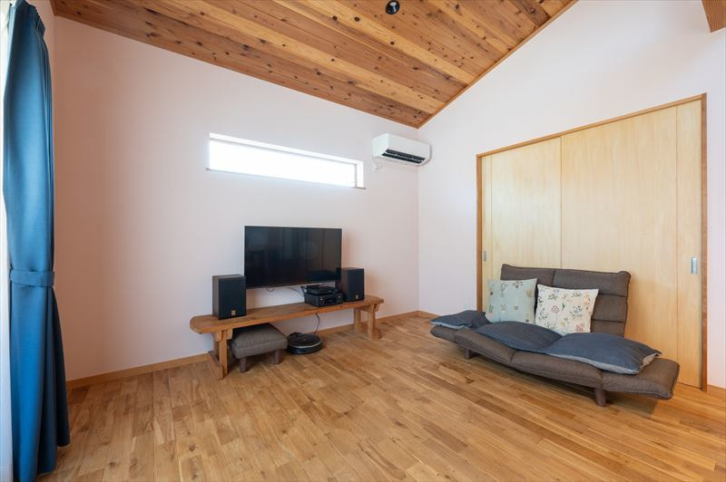 南側の窓を天井近くに追加したのも、空が見えていい感じです。床もすべて無垢板にしたので、とても肌触りが良いです。